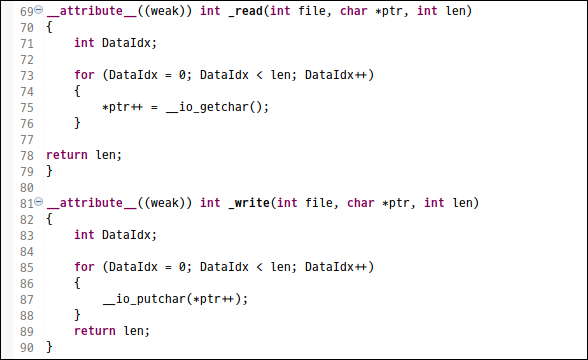 시스템콜인 _read()와 _write() 함수를 아래와 같이 재정하여 간단하게 UART로 표준 입출력으로 설정할 수 있다
