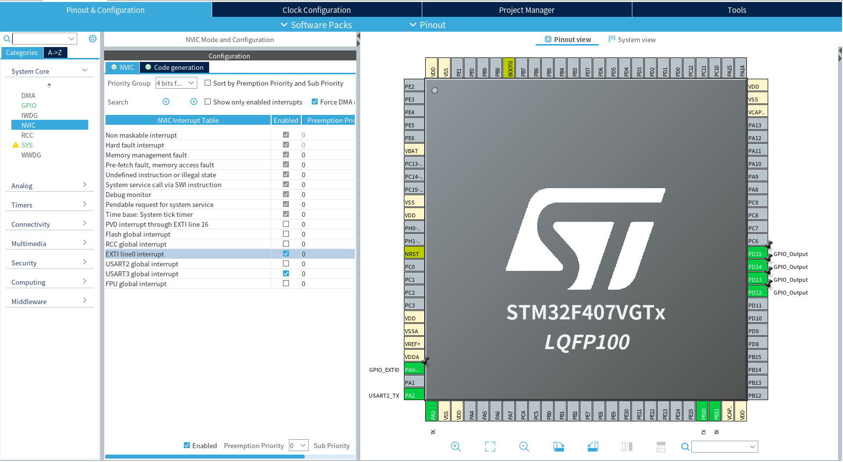 CubeIDE를 사용하여 STM32F407VG의 Pin 설정을 위 이미지와 같이 하였으며, Blue 버튼 인터럽트로 PA0를 설정하여 ESP 모듈의 TCP 서버를 종료시킬 예정이다. GitHub에 소스코드를 올려놓았으며 아래 링크에 전체 코드가 있다.