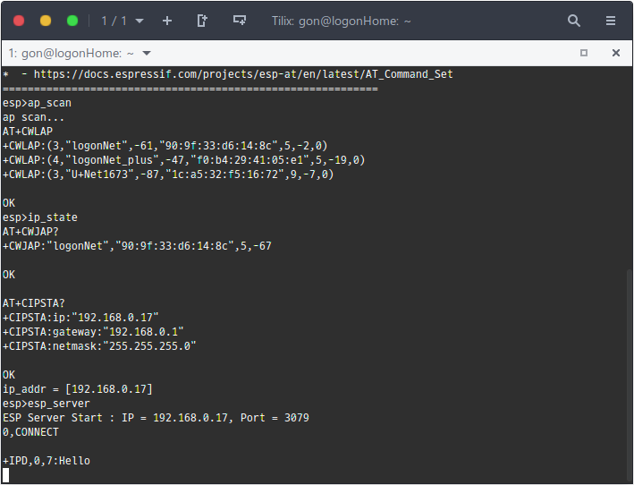 어쨌뜬, ESP의 AT Command 명령어를 사용하여 TCP 서버를 시작하여 PC에서 파이썬으로 Hello 메시지를 보낸것이 STM32에서 출력되는 것을 확인하였다. 이것을 바탕으로 PC 프로그램이나 웹에서 STM32 보드를 제어하는 앱을 간단하게 만들볼 생각이다.