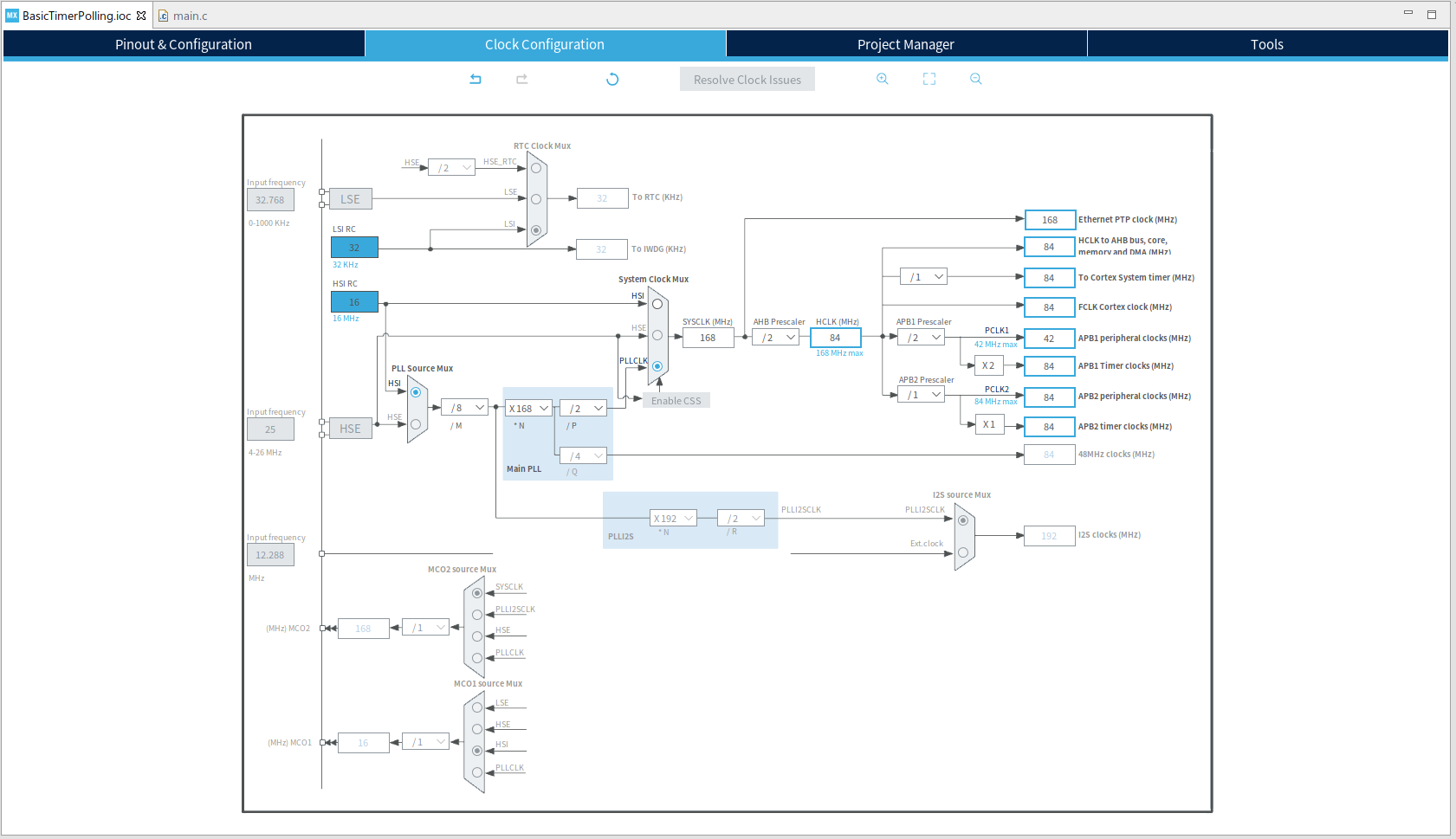STM32F407 데모보드의 TIM6 최대 클럭은 84MHz이기 때문에, 위 블로그를 참조하여 1초 타이머의 prescaler과 period 값은 아래와 같이 설정하였으며, 타이머 처리 방식(폴링/인터럽트/DMA)에 따라 추가적인 설정을 해야 한다. 그리고 TIM6가 연결된 APB1 버스의 클럭이 84MHz가 되도록 아래와 같이 설정하도록 한다.