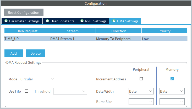 위 eziya's 블로그에서 설명했던 것처럼 TIM6는 DMA1 연결되어 있기 때문에, DMA로 LED(GPIOD Pin)에 데이터 전달이 불가하기 때문에 APB1 연결되어 있는 UART2로 데이터를 전달하도록 하였다. 기존 CubeIDE TIM6 설정에서 DMA 항목을 아래 이미지와 같이 추가하도록 한다.