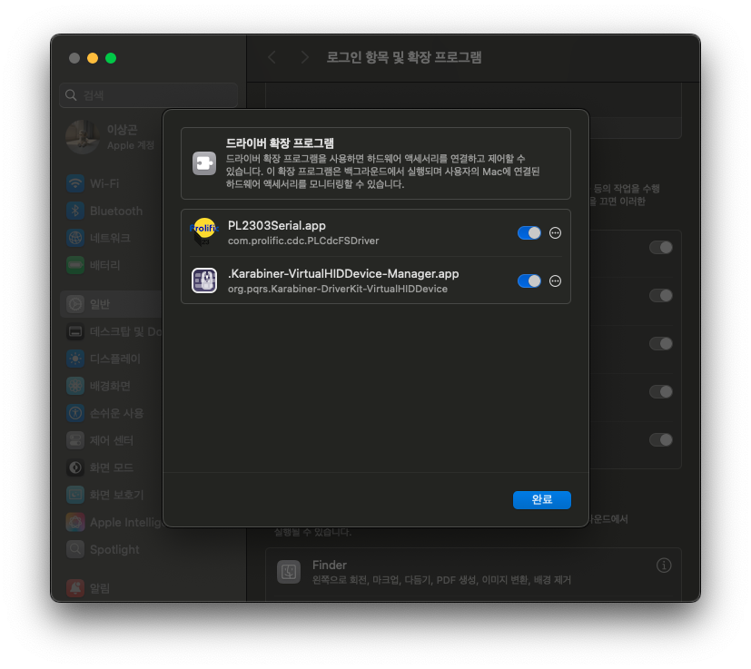 드라이버 설치 완료 후, 아래 이미지와 같이 설정에서 일반 → 로그인 항목 및 확장프로그램에서 PL2303 드라이버를 활성화 시켜야 한다.