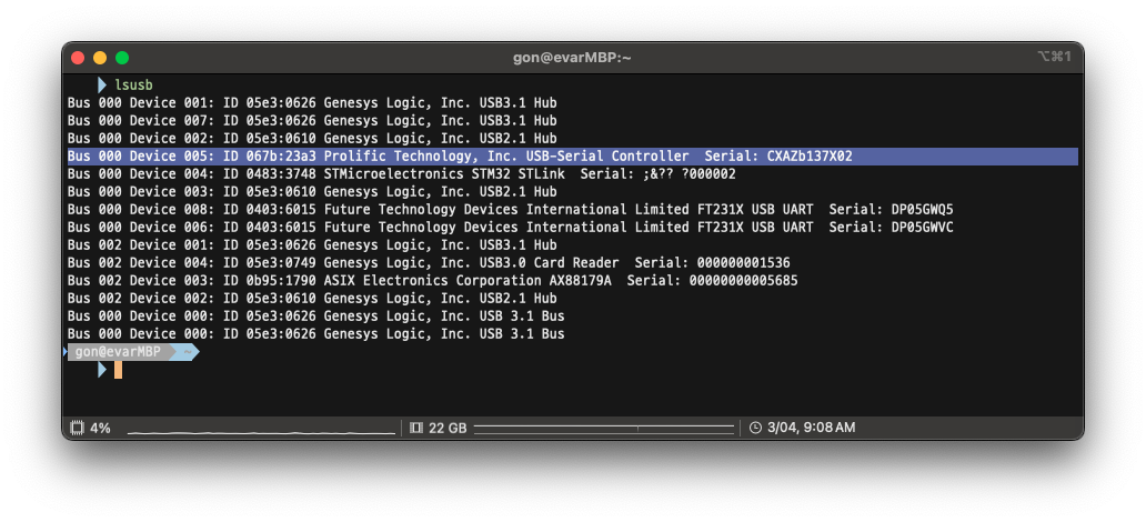 brew로 간단히 설치가 가능하며, macOS에선 PL2303 드라이버가 설치되어 있지 않아서 추가로 설치해야 한다. 일단 macOS에서 인식은 제대로 되었는지 확인하기 위해 lsusb 명령어를 치면 아래와 같이 출력되는 것을 확인할 수 있을 것이다.