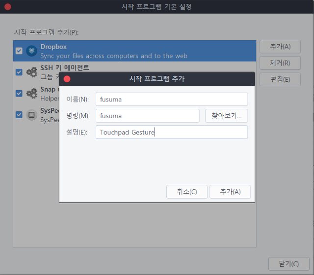 우분투 시작 프로그램에 아래와 같이 fusuma를 등록하면 우분투 데스크탑 시작시 바로 가능하다.